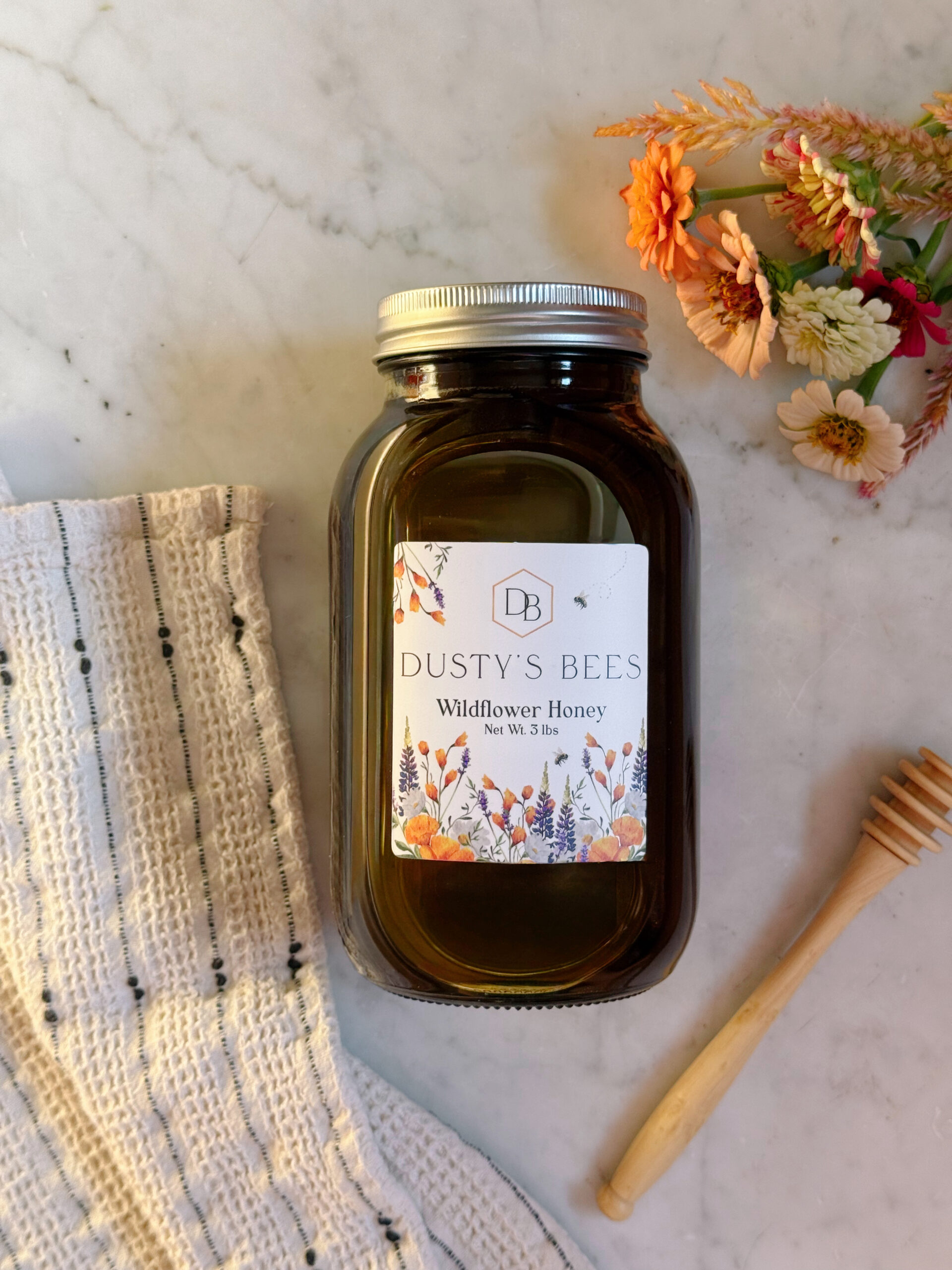 3 Pounds of Raw Wildflower Honey in a glass jar. Our wildflower honey is all natural and has not been processed or altered in any way.  Great for allergies and natural remedies.  You are buying honey directly from us the beekeeper!  Don’t be fooled by fake honey in your grocery store. Try real honey from real beekeepers!